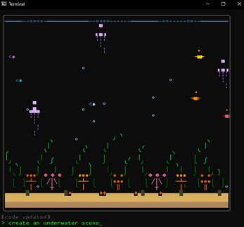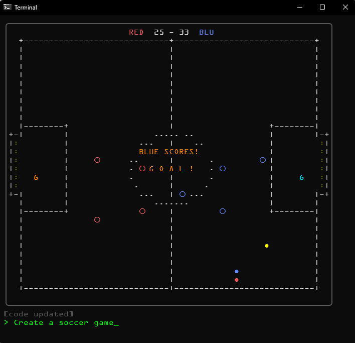 You type what you want to see. A 64x32 character grid comes alive. Each prompt builds on what's already running. The model sees the current code and extends it. /clear to start over.